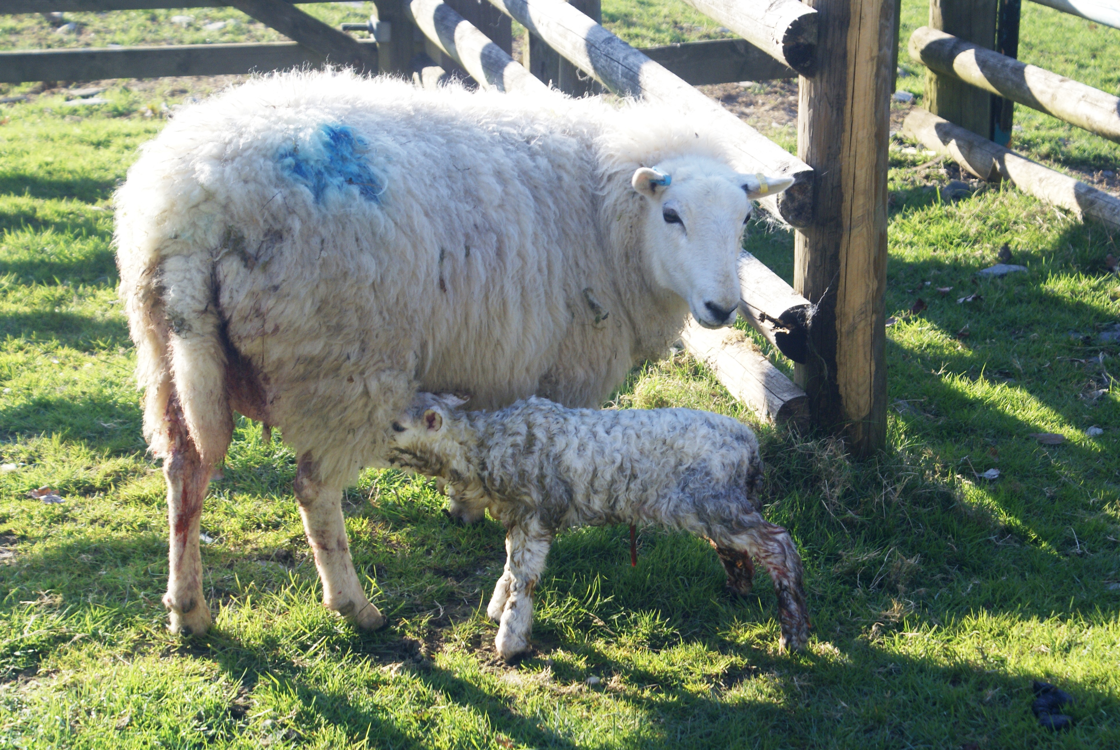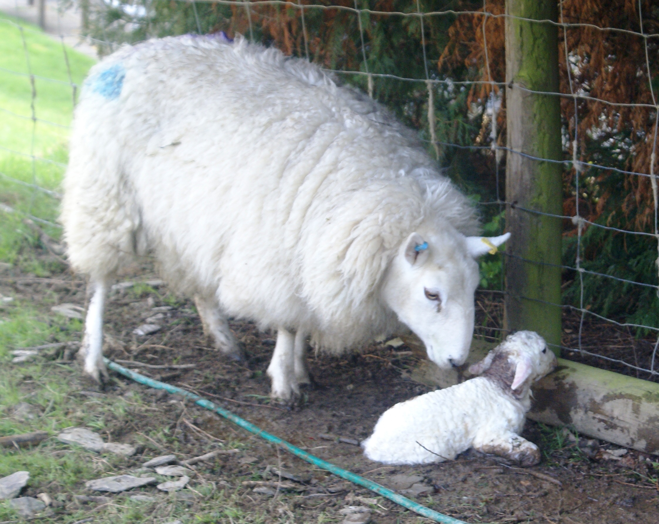 They were left in peace in our top field and the others brought down to the fields around the house, I was out. The first thing I knew about what was going on was when I was eating my lunch in the sunshine and heard a strange baa — like a child imitating a sheep — I went to investigate and found a bewildered young ewe with tummy ache. But something was wrong — didn’t I say that anything that could go wrong would go wrong? It’s the 1st rule of rearing anything! She was agitated, as well she might be, and not progressing in her labour. I tried to catch her which only reminded me why I had decided to stop lambing in the first place. I phoned the shepherd, who phoned her dad, who borrowed her dog, who came and caught the ewe.