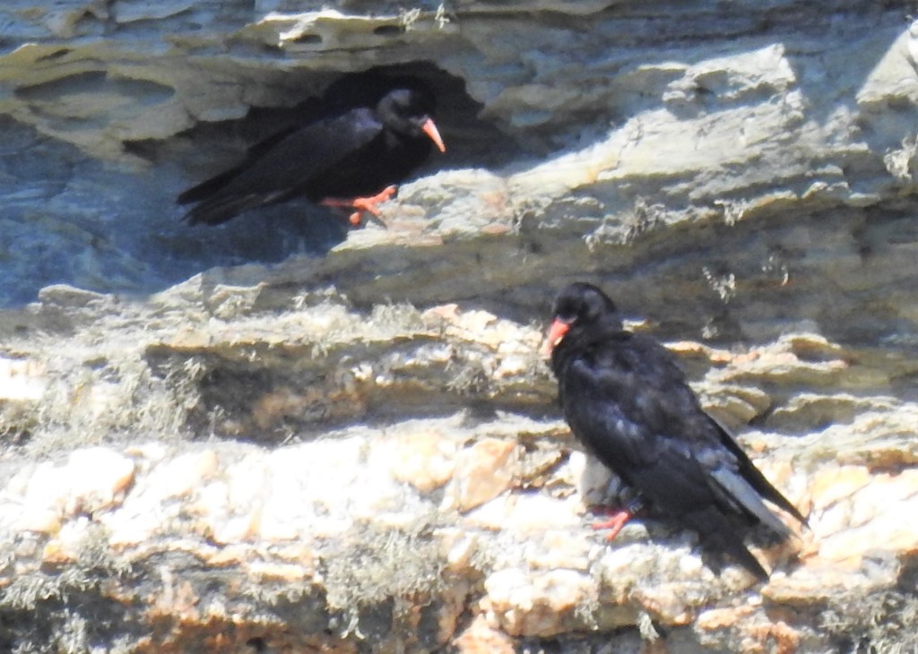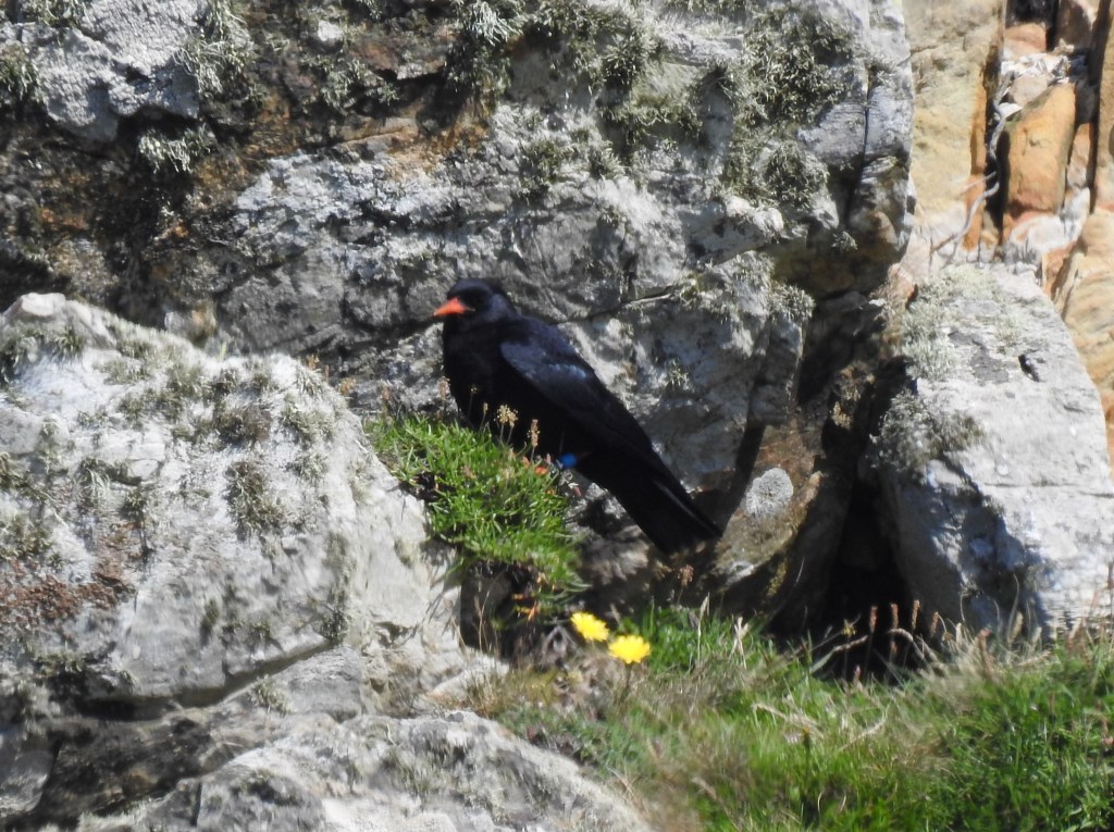 Since the slight relaxation of the Corona Virus Lockdown in Wales we have renewed our search for the elusive chough. There are more in Wales than anywhere else in the UK but still probably only just over 200 pairs, mainly in coastal areas where they feed on invertebrates associated with grazing animals. They like a short sward and lots of creepy-crawlies in the droppings of the animals that crop the grass.