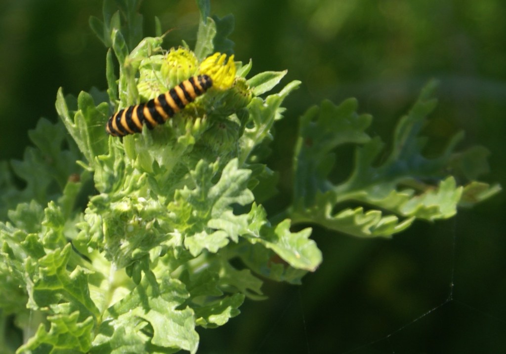 The Cinnebar Moths are protected from predation by absorbing the toxin from the ragwort that makes them foul tasting. When we were children one rarely saw Ragwort as it was zealously sought out and destroyed by farmers as it was known to cause liver failure and death in horses. The toxic alkaloid, Pyrrolizidine, is metabolized by the liver which it gradually destroys — however, nowadays the risk is not thought to be high as the dose needed is great — still, best kept out of pasture and hay.