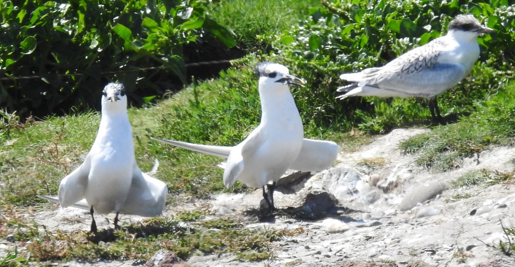 Sandwich Terns breed here in large numbers (third largest breeding colony in the UK), they are a little bigger with black bills with yellow tips.