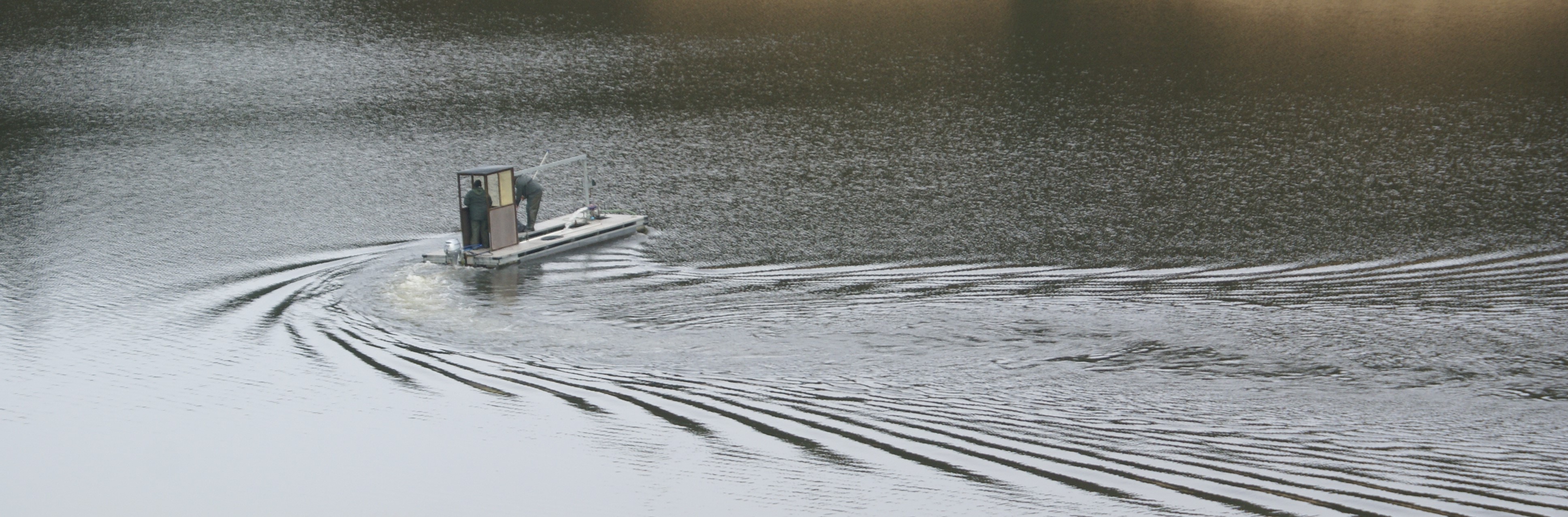 Up above the dam on the reservoir the water bailiffs plough the surface with their extraordinary craft — seeding the waters with trout, scooping them out of the tank and gently laying them in the water — quite large fish, refreshed while in the crowded tank by a constant stream of water.