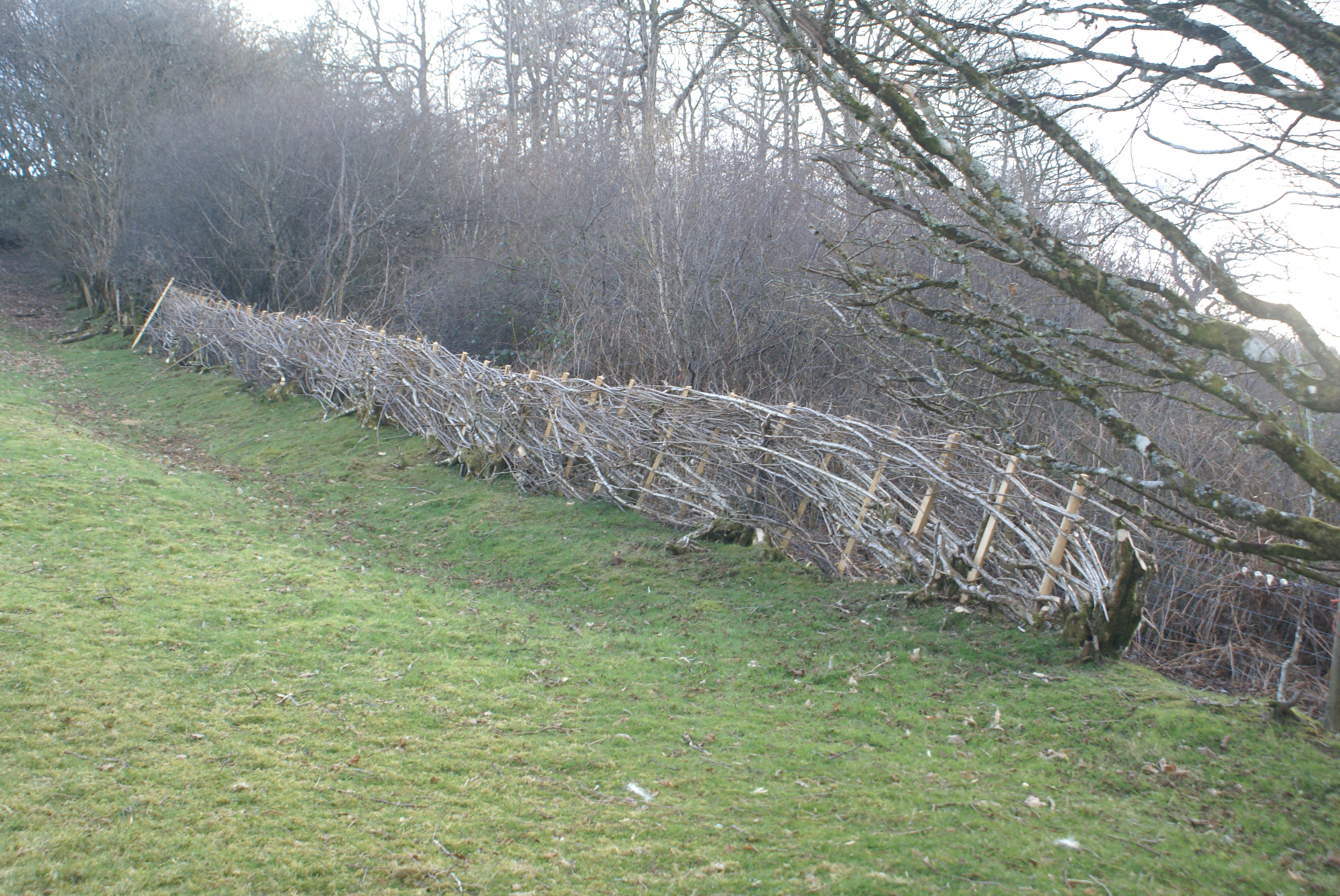 Now Bill involves himself in earnest. He rattles the fence and whacks the hedge with a stick. The young ewe turns and forces her way up hill again leaving much of her fleece hooked on the hedge. I am placed at the top end of the laid section of hedge ready to turn her as she escapes from its grasp and drive her down to the gate. I shine the torch, wave my stick and bellow — as she passes I drop my tools and lunge at her neck and we proceed, she with her four-wheel-drive, me horizontal, my arms clamped around her neck. The brambles grab at me but are no match for this determined yearling. We continue our down hill trajectory in the pitch black. I decide she should go alone and let go — she is after all going in the right direction.