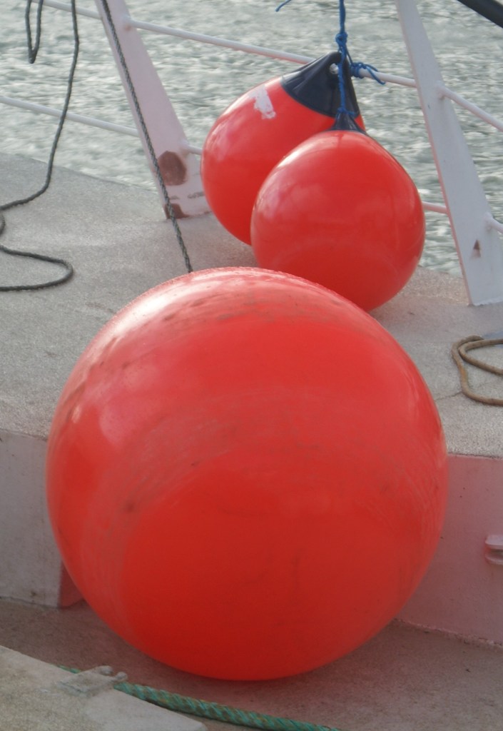 The bright young boats are hung with clusters of fenders like boat-eggs, tended by fishermen.