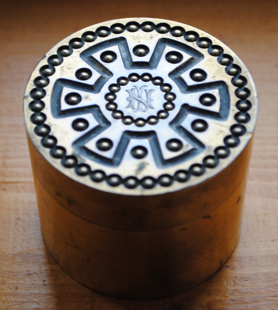 In the March before he died Gilbert made Isabella this little pot which stands on my windowsill to this day. This must have been a wedding present — the monogram ‘IN’ is for her married name and the tiny inscription — his maker’s mark: GR Betjemann fecit, March 1896, 2 months after her marriage.