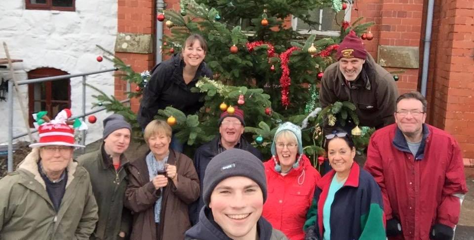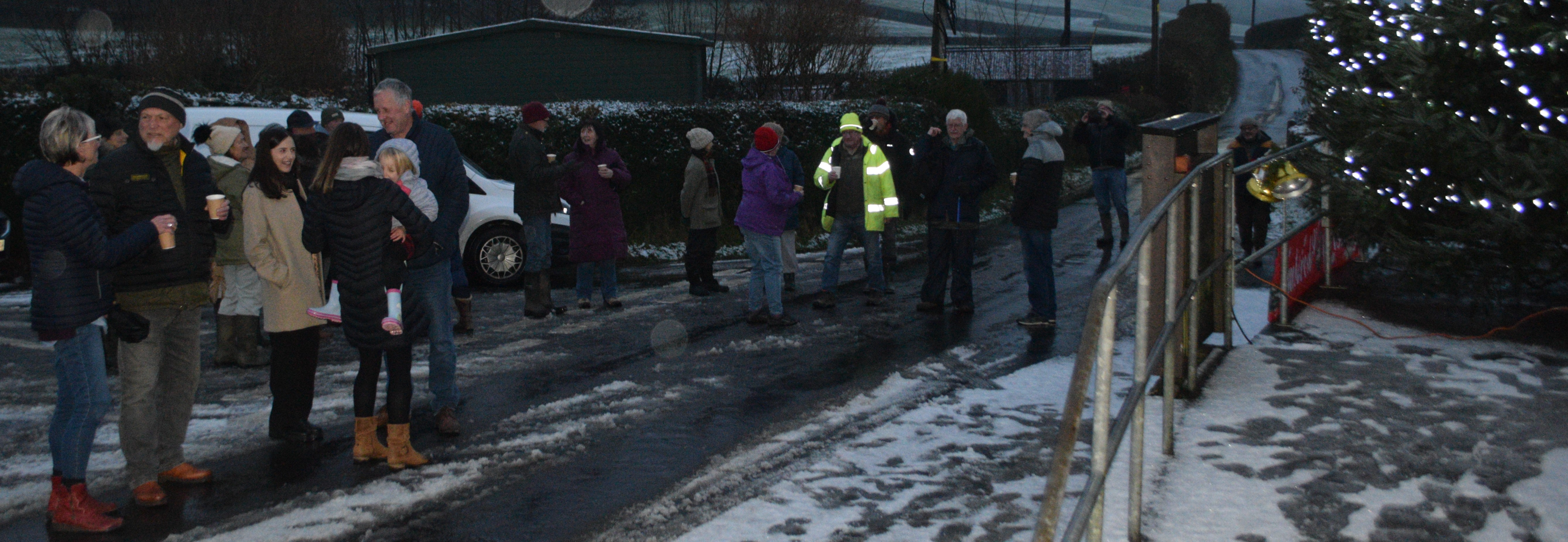 But we make it to Llawr-y-glyn without falling and we aren’t the only ones – 30 odd villagers who should all know better, are there to drink mulled wine in the gloaming, dodging the drips and the gushes from the puddle on the canopy, as a public spirited citizen pokes it from beneath with his brolly wetting all the mince pies.