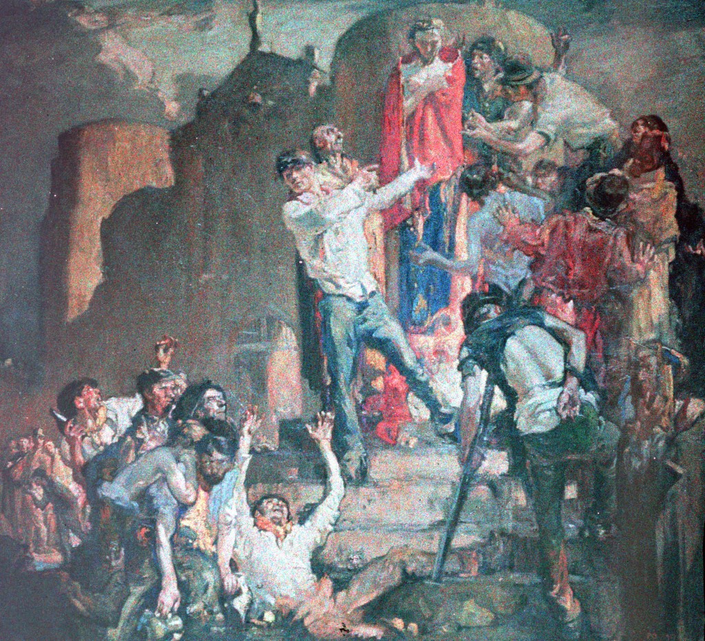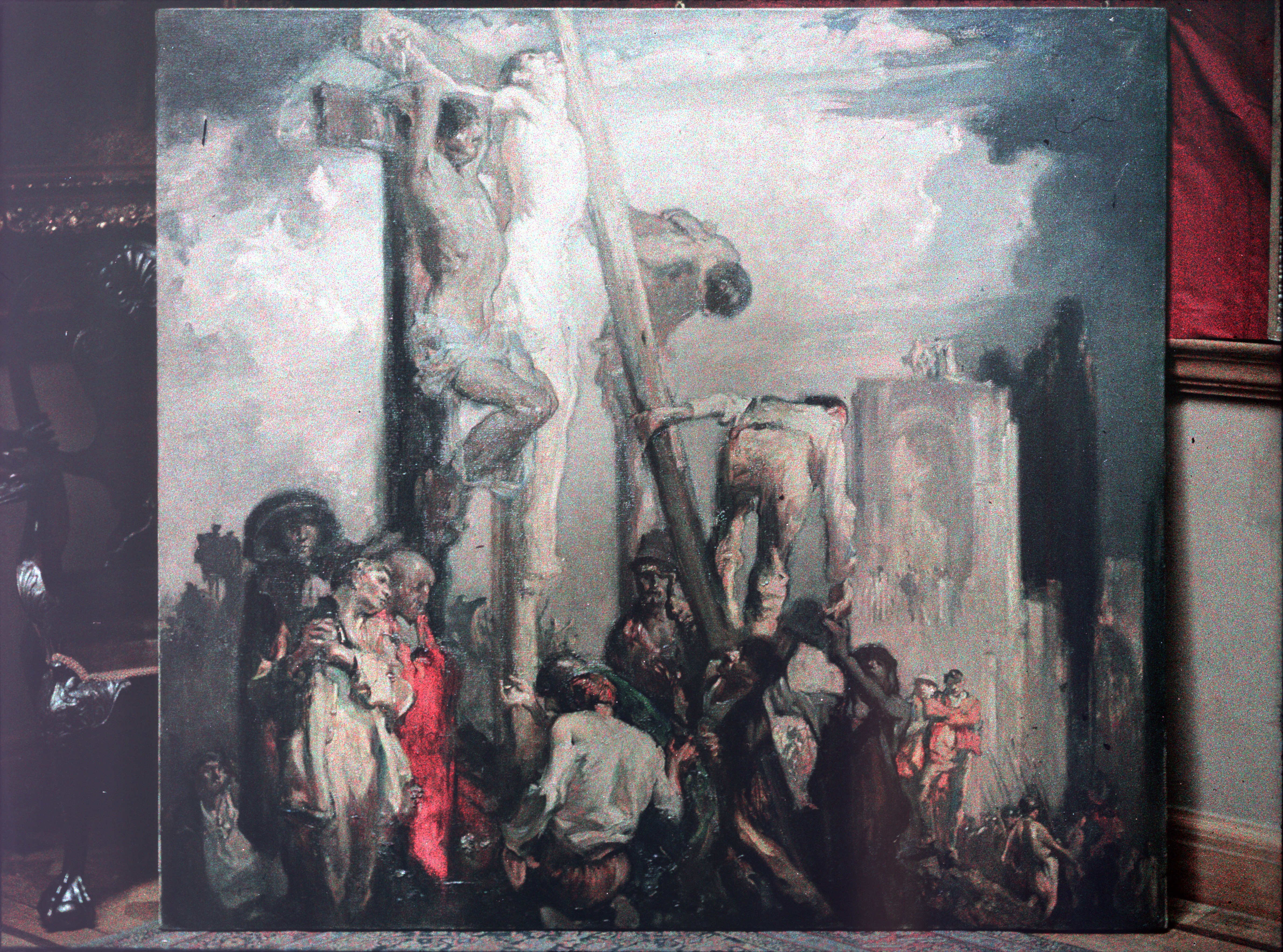 Firstly — a harrowing picture of the crucifixion, clearly a large oil painting, unframed and leaning against a chair, by an artist I recognised. My grandfather, as a young man had been involved in representing and selling this man’s work before 1934 when he worked with his wife’s cousin David Croal Thomson, at the London gallery, Barbizon House. It was during the depression and eventually went bust. The artist was Sir Frank Brangwyn (1867-1956) who I have heard described as the Welsh National Artist. The actual painting survives and I have tracked it down today to Glasgow Life Museum, but not precisely enough for us to be able to visit it.