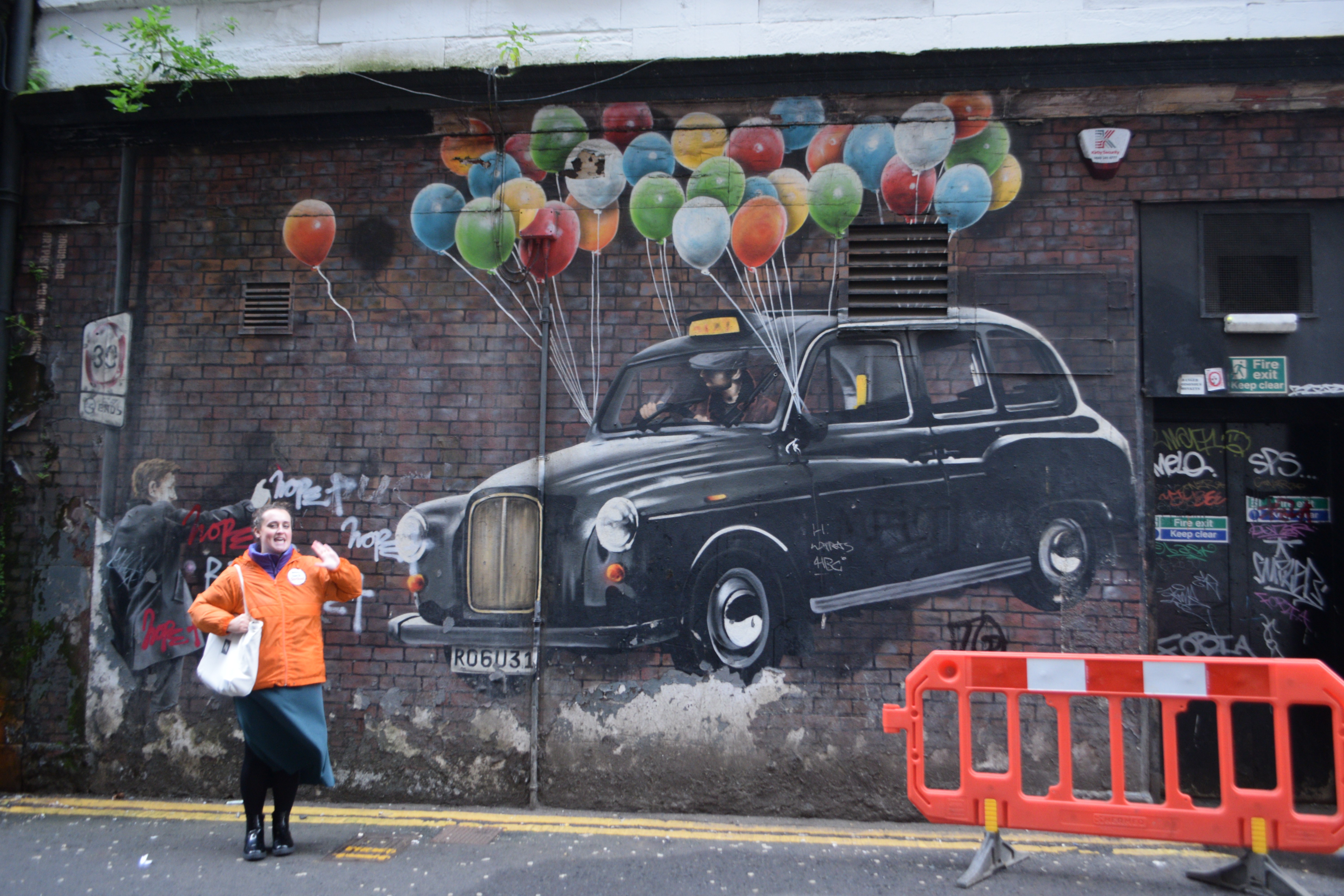 Below is Grace, our guide to the city showing us the World’s Most Economical Taxi by Rogue One containing the artist’s self portrait as the driver and commissioned by the owner of the wall, a tribute to her husband, a cabby.