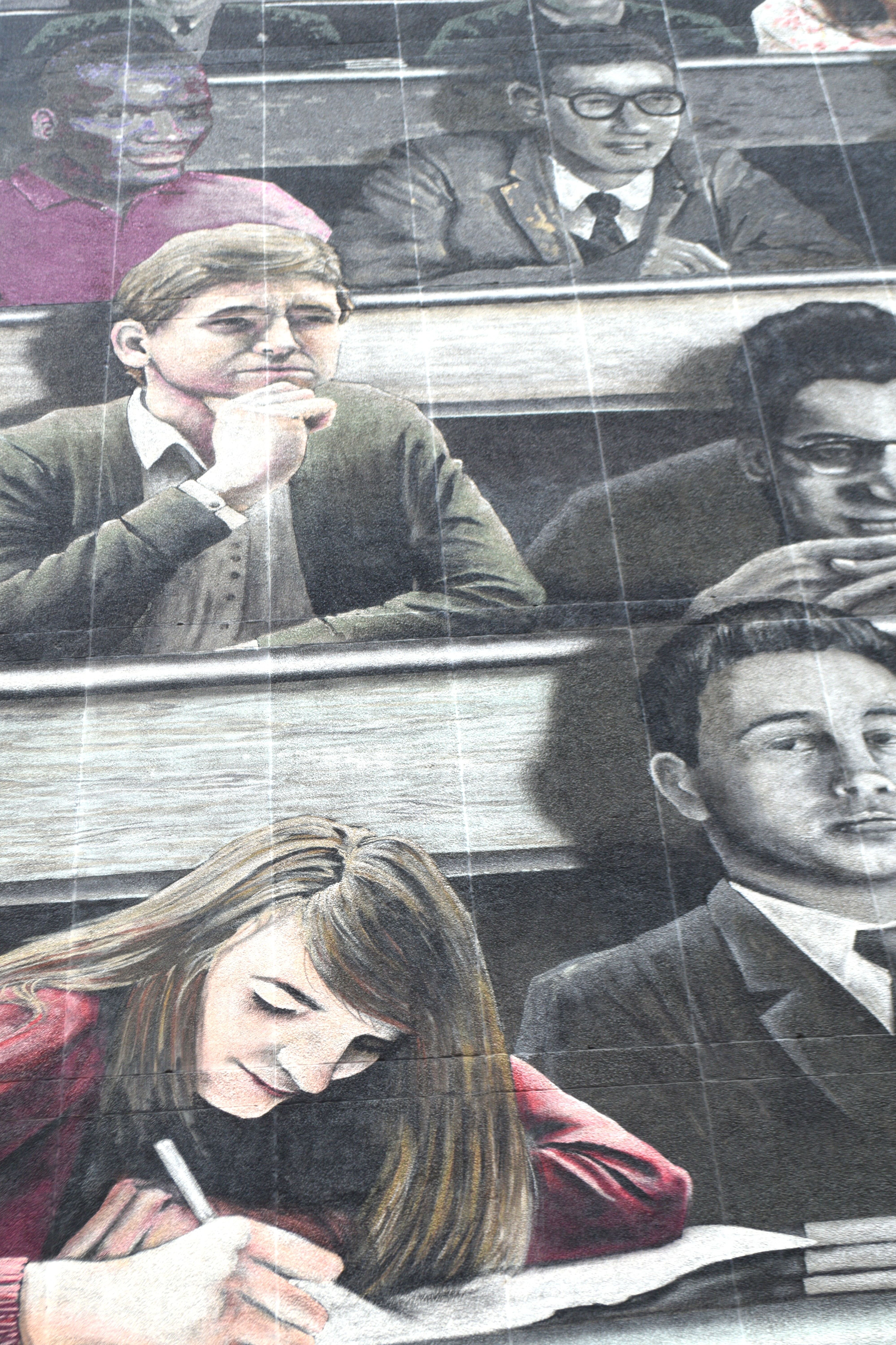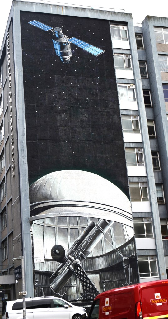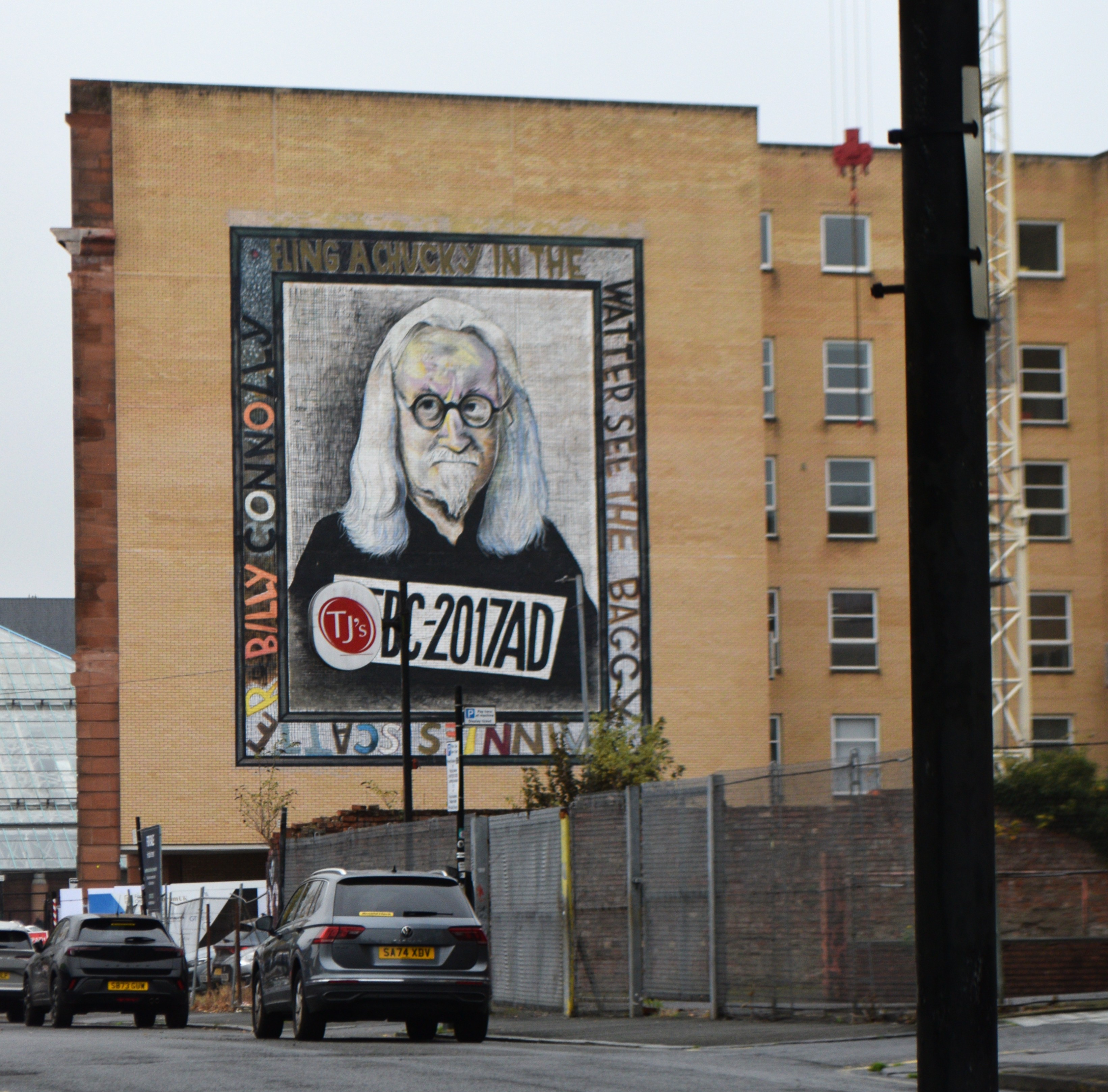 Here he is in youth on the left, after a painting by Jack Vettriano, in a massive mural by Rogue One and Artpistol. On the right, he is seen in later life.