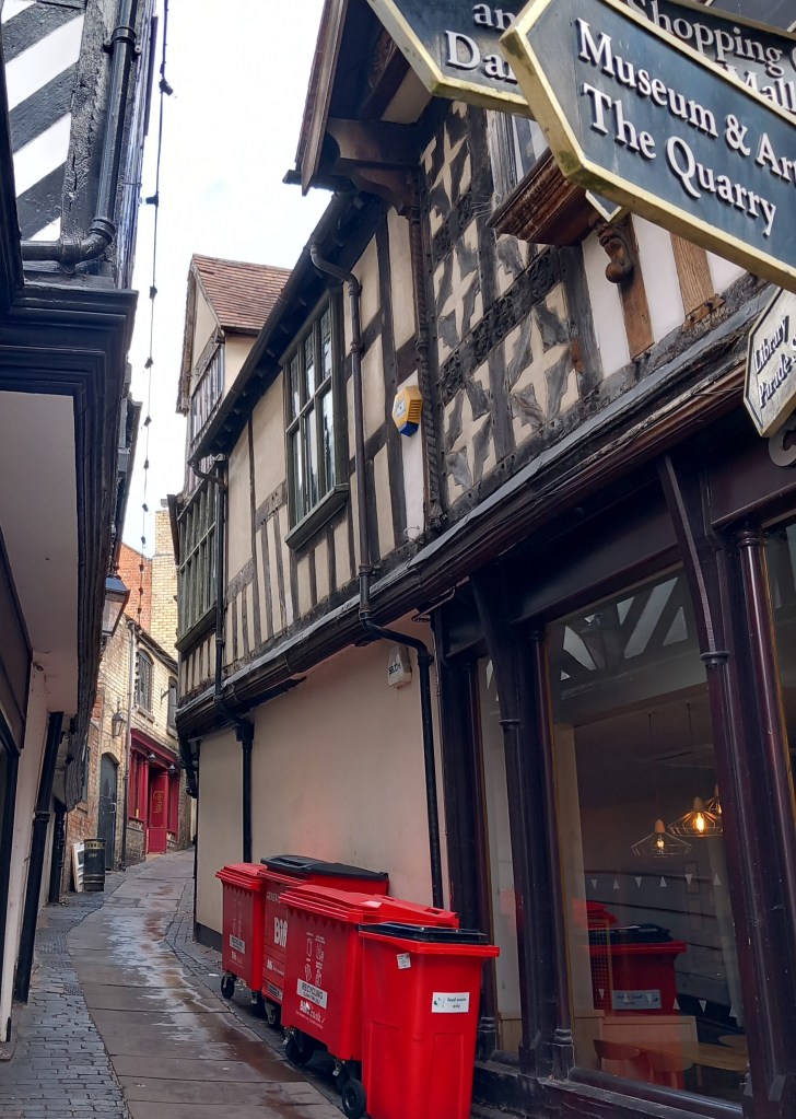 The town is full of tantalising mediaeval alleyways– note how the common gutter has been replaced by festive commercial waste bins — I miss the piglets, dogs and red kites scavenging on the waste!