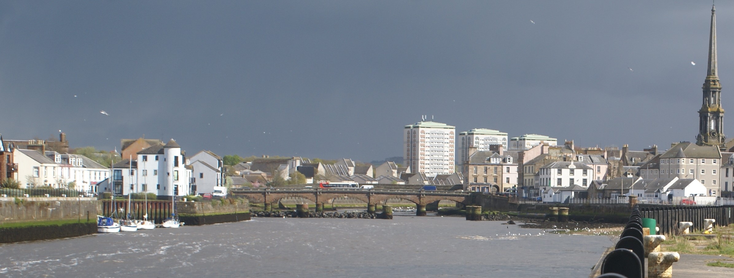Beyond the two road bridges you can just see the rail bridge — all are quiet as Scotland is only just opening up again after lock-down. The A1 now by-passes the town and crosses the Tweed up river of the town.