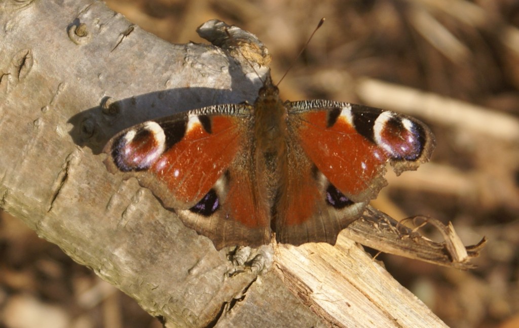 Sylvie, I expect you have seen one of these, they have spots called eyes — like the ones on the tail of a peacock so it is called a peacock butterfly. But when he folds his wings he looks black.