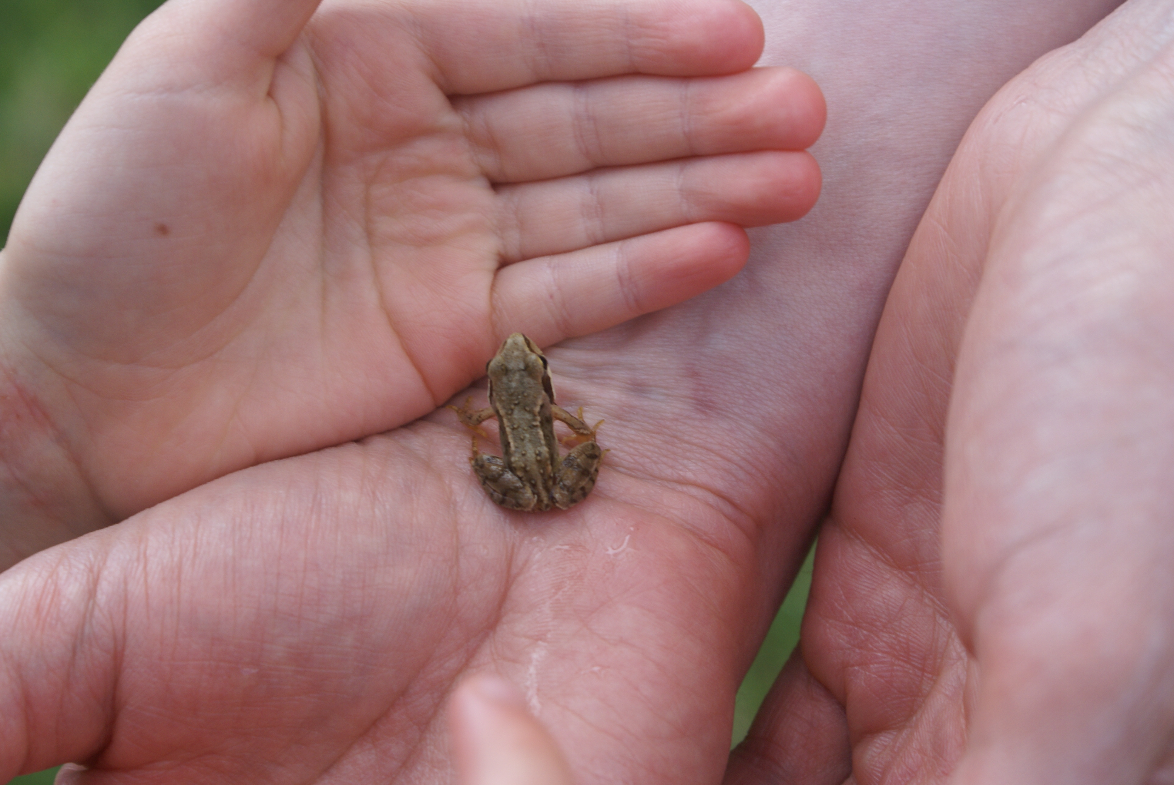 We found lots of big Tadpoles none with legs but someone found a friendly baby frog in the bog.