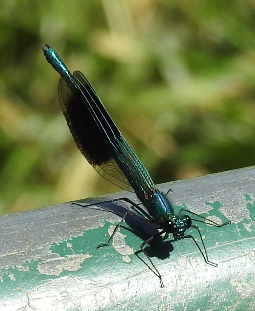 Different species of dragonflies fill different niches in the water-side world. Hawkers, skimmers and darters prefer standing water whereas the large red damselflies like bogs and ditches. The beautiful demoiselle (that’s its name) and the banded demoiselle like running water like the stream in our valley. Damselflies perch with their wings folded, are smaller and daintier, flutter more weakly and have eyes that are more widely spaced — the eyes of dragonflies meet in the middle.