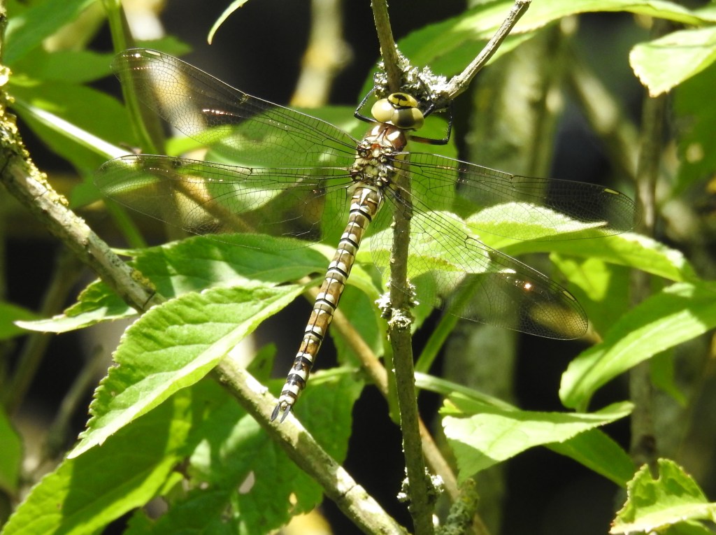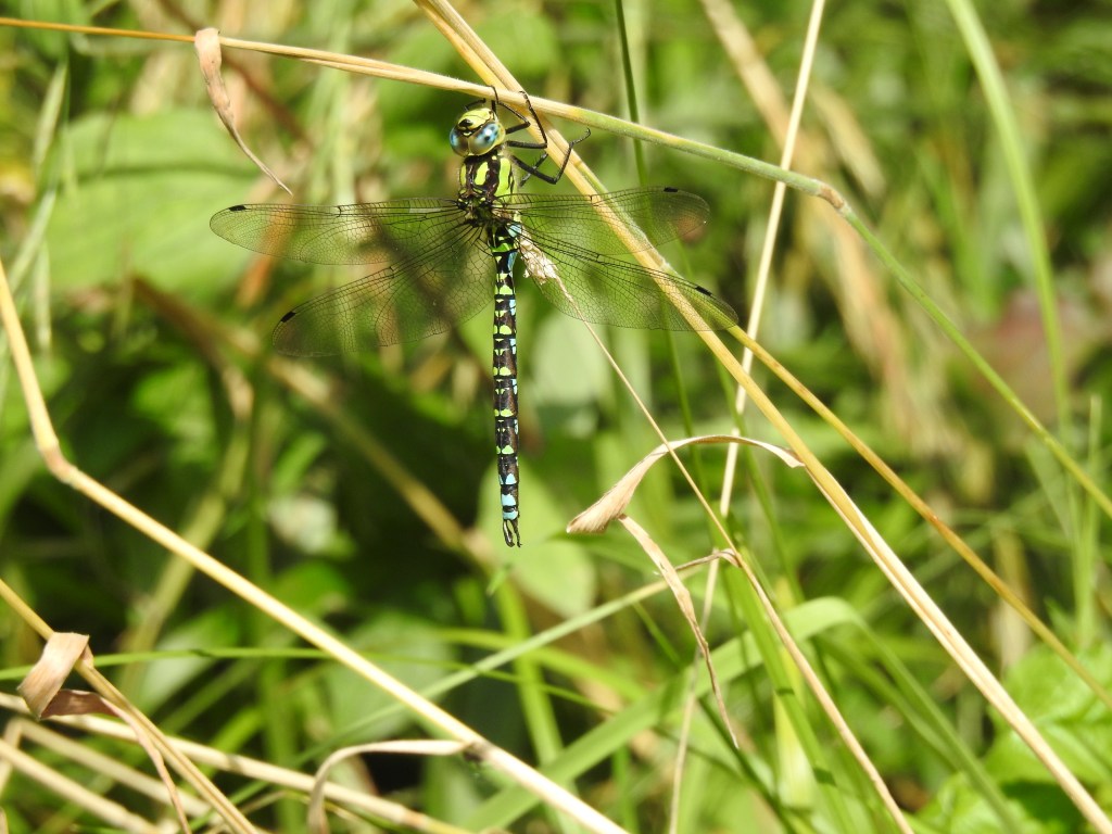 Adult dragonflies like the Southern Hawker are very territorial so you will usually only see one on a particular stretch of pond bank except when an interloper enters his territory when there will be an aerial skirmish — a dog fight — the resident male seems usually to prevail and the interloper withdraws to find another territory. When a female appears the male will try to mate with her, grabbing her by the scruff of the neck with claspers on the end of his abdomen. If she is willing she curls her abdomen round to the accessory genitalia on the ventral side of his abdomen just below his waist where he keeps his sperm — thus they form a conjugal wheel or copula. You will see them flying, conjoined like this in tandem. They lay their eggs in water or on submerged vegetation depending on the species. Sometimes the male guards the female while she lays but in some species you will see them, still in tandem — the male holding the female by her neck and dipping her tail into the water to lay, then pulling her out — escaping the powerful surface tension of the water — to dip her in at another location, spreading their bets and increasing the chances that their offspring will survive.
