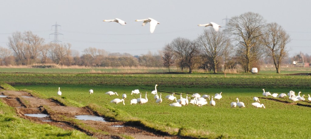 We are looking for the flocks of whooper swans that spend their winters here, grazing the drier fields by day. There are also Bewick swans that breed in northern Russia — harder to find, becoming quite scarce, smaller, more delicate with less yellow on their bills. We see a few of these timid birds at Welney, but too far away to photograph.
